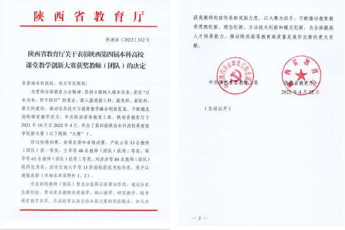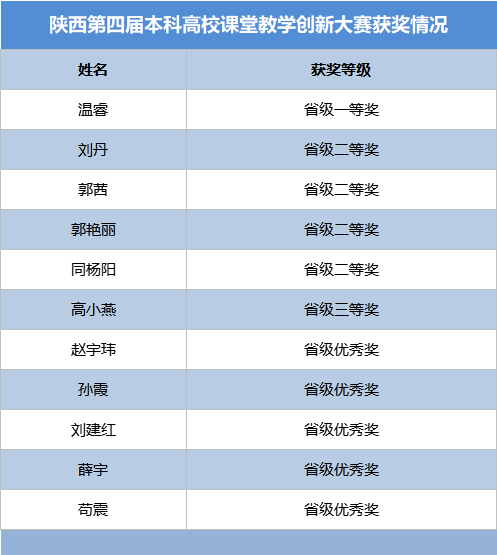 近日,陕西省教育厅公布了第四届陕西高校课堂教学创新大赛获奖教师名单,云博app官方在线入口教师温睿获省级一等奖,刘丹、郭茜、郭艳丽、同杨阳4位教师获省级二等奖,高小燕获省级三等奖,赵宇玮、孙霞、刘建红、薛宇、苟震5位教师获省级优秀奖,云博app官方在线入口获优秀组织奖。吴丰华、于春2位教师代表陕西省参加全国高校教师教学创新大赛。