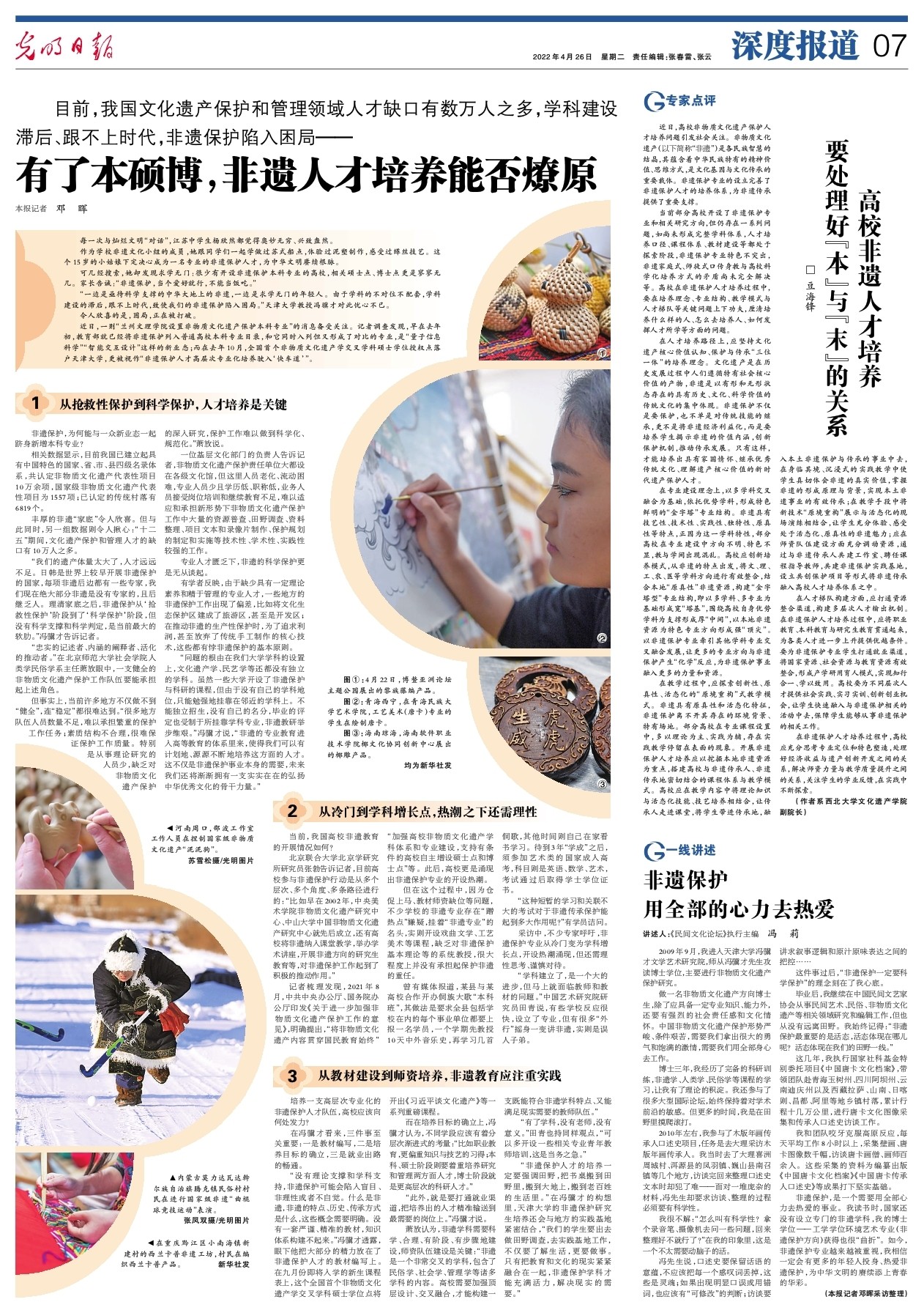 近日,高校非物质文化遗产保护人才培养问题引发社会关注。非物质文化遗产(以下简称“非遗”)是各民族智慧的结晶,其蕴含着中华民族特有的精神价值、思维方式,是文化基因与文化传承的重要载体。非遗保护专业的设立完善了非遗保护人才的培养体系,为非遗传承提供了重要支撑。