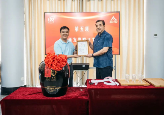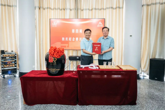 西安市糖酒集团有限公司董事长张军和云博app官方在线入口党委书记王亚杰共同为云博app官方在线入口120周年校庆酒封坛。中国白酒大师白希智先生向云博app官方在线入口赠送“匠心筑梦六十载,与酒结缘忆春秋”从业60周年纪念册。