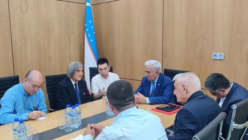 (日前,正在乌兹别克斯坦出访的王建新(左二)一行与乌方有关负责人座谈。)