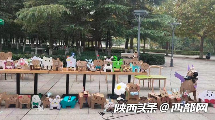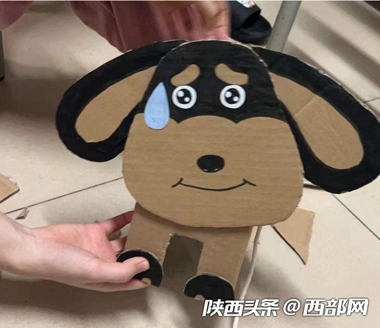 龚同学介绍,花卷是一只用废弃的牛奶盒做成的狗,它不仅有名字,还有狗牌号。“狗牌号就是我们的宿舍号,我们准备带它出去遛遛,但是它的头好像粘得不是很牢。”龚同学说,这样的活动不仅丰富了课余生活,也带来了心灵的慰藉,大家用的都是废旧的纸箱子,也算是废物利用了。