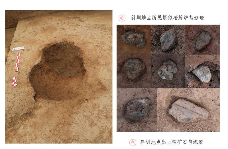 斜圳地点位于城址内东北部,发现有冶炼残炉、铜矿石、炼渣和炉壁残块等冶铜遗存;并发现较大面积夯土建筑基址、大量废弃陶瓦残片和刻文陶器,在一块陶器残片上发现了“周”字陶文。从出土遗物可判断,该地点冶铜和建筑基址的年代集中在西周早中期。