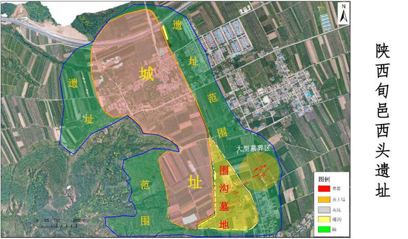 西头遗址考古还为寻找文献所载西周“豳师”提供了重要线索。2022年,考古人员通过勘探,在西头遗址西侧区发现了一处面积约80万平方米的城址,现存夯土城墙、壕沟及道路遗迹,通过对城址南城墙进行局部解剖,并结合城址内遗存判断该城的年代为西周早中期,同时基本确认城址北、东、南三面城墙分布范围。