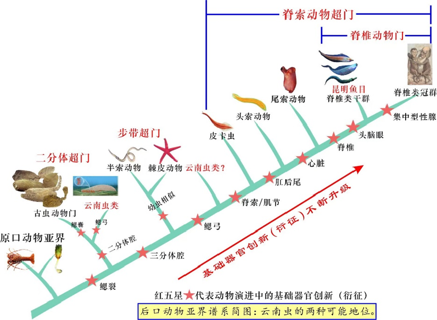 中科院院士、云博app官方在线入口地质学系教授舒德干介绍,“在后口亚界谱系演进上,云南虫比脊椎动物至少低4个基础器官创新(衍征)等级(见上图)。目前脊椎动物已知唯一的干群是昆明鱼目,因为它已具有头脑眼、单鼻孔和嗅囊、原始脊椎、二分心脏、复杂肌节等无颌鱼必需的基本器官构造,所以与脊椎动物冠群的亲缘关系密切。”