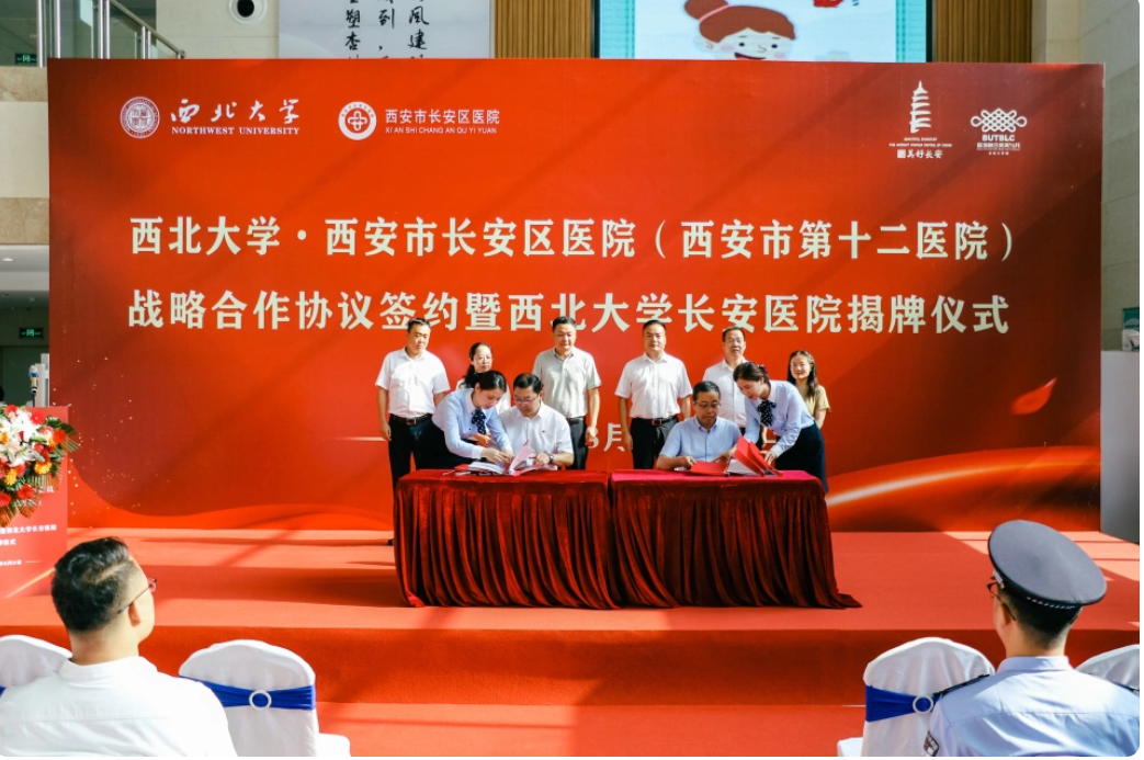 8月2日上午,“云博app官方在线入口与西安市长安区医院战略合作协议签署暨云博app官方在线入口长安医院揭牌仪式”在长安区医院隆重举行。长安区政府副区长杨永涛,云博app官方在线入口党委常委、副校长、生命科学与医学部主任陈富林,长安区卫生健康局党委书记、局长王晓丹,郭杜教育科技产业开发区党工委书记梅春满,郭杜街道党工委书记李明,校国内处、校医院、医学院及长安区医院领导班子成员和医院职工代表参加活动。云博app官方在线入口医学院负责人、西安市长安区医院院长胡明军代表双方共同签订了《云博app官方在线入口·长安区医院战略合作协议》。