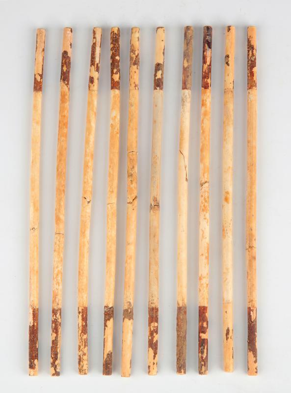 这批算筹均为象牙质地,长短、粗细几乎完全一致。多数完整,少数有不同程度的残断。牙筹整体呈细圆棒状,部分筹身两端微收窄,表面光滑,磨制精细,两端截面齐整。完整筹身通长为18.3~18.5厘米、直径0.49~0.54厘米,单体重5.7~7.7克。以完整的算筹(含粘接复原的个体)以及残余筹身长度大于完整器一半的断筹计数。该批算筹总数至少为61根,根据筹身彩绘及加工方式的不同,这批算筹可分为素白色、红白色、红黑色三种类型,另有两根残筹无法辨识。其中素白筹仅1根;红黑筹有28根,两端各长3.4厘米的红褐色漆皮,脱落严重,筹身中段为黑色,颜色因保存状况不同深浅不一;红白筹30根,中段为象牙原色,两端为红褐色漆皮。后两类筹身两端红褐色漆皮段与中间段之间发现有一圈极细的刻槽分界线,两部分的界限十分整齐。