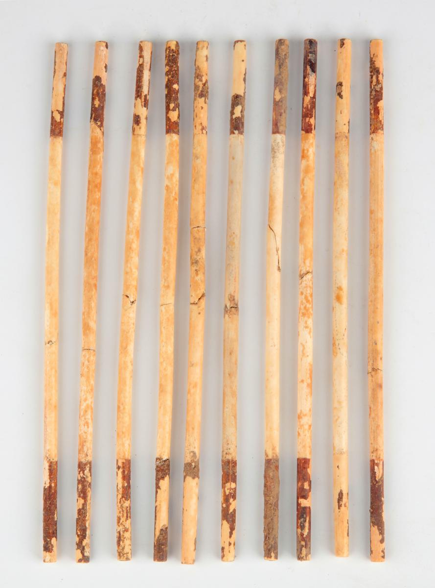The rods were delicately made, with an almost identical length and thickness. Most were found intact, but several were broken. They are cylindrical, with some narrowing slightly at both ends. They have smooth surfaces and were finely polished, with neat cross-sectional ends.