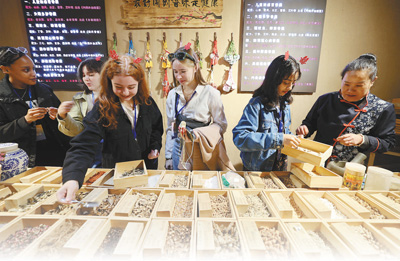 10月14日,在山东省临沂市沂南县铜井镇竹泉村,外国留学生在体验制作中药香囊。
