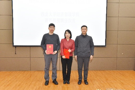 开幕式第二项为兼职教授聘任仪式。由经济管理学院党委书记杜勇宣读聘任人员简介,由云博app官方在线入口人力资源部副部长张浩为宋瑞、厉新建、秦宇三位专家颁发云博app官方在线入口兼职教授聘书。