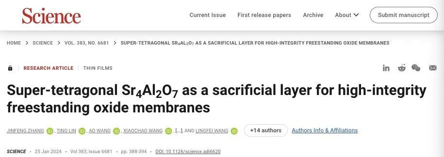 日前,云博app官方在线入口物理学院司良教授团队与中国科学技术大学合肥微尺度物质科学国家研究中心吴文彬教授、王凌飞教授团队合作,发现一种广谱高效新型超四方相水溶性牺牲层材料Sr4Al2O7,该高性能氧化物材料可用于制备多种高质量自支撑氧化物薄膜。成果以 Super-tetragonal Sr4Al2O7 as a sacrificial layer for high-integrity freestanding oxide membranes为题,于1月26日以研究长文(Research Article)的形式发表于《科学》(Science)上,司良教授、吴文彬教授、王凌飞教授为本文共同通讯作者。