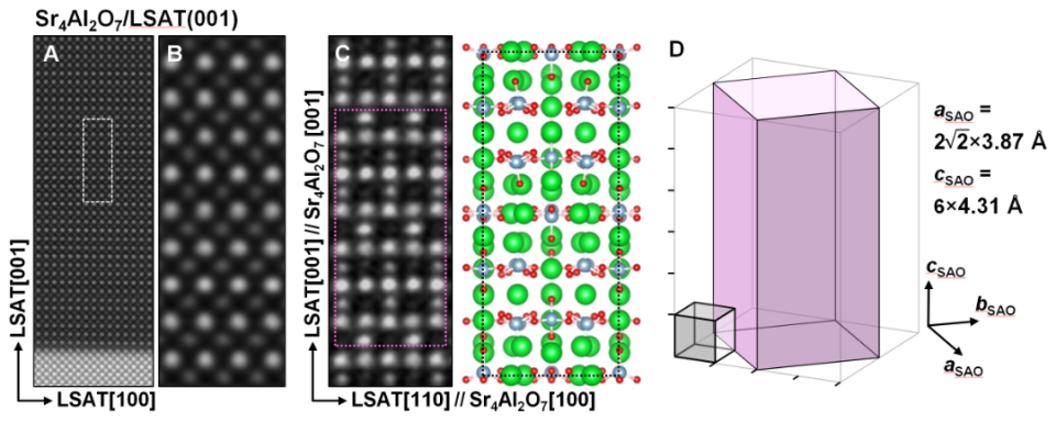 针对以上问题,研发团队成员深入探索Sr-Al-O基水溶性薄膜激光分子束外延生长窗口,通过精细的薄膜生长控制技术发现一种新型水溶性牺牲层材料Sr4Al2O7,系统性实验表征和第一性原理材料模拟计算展现其诸多优异性质。