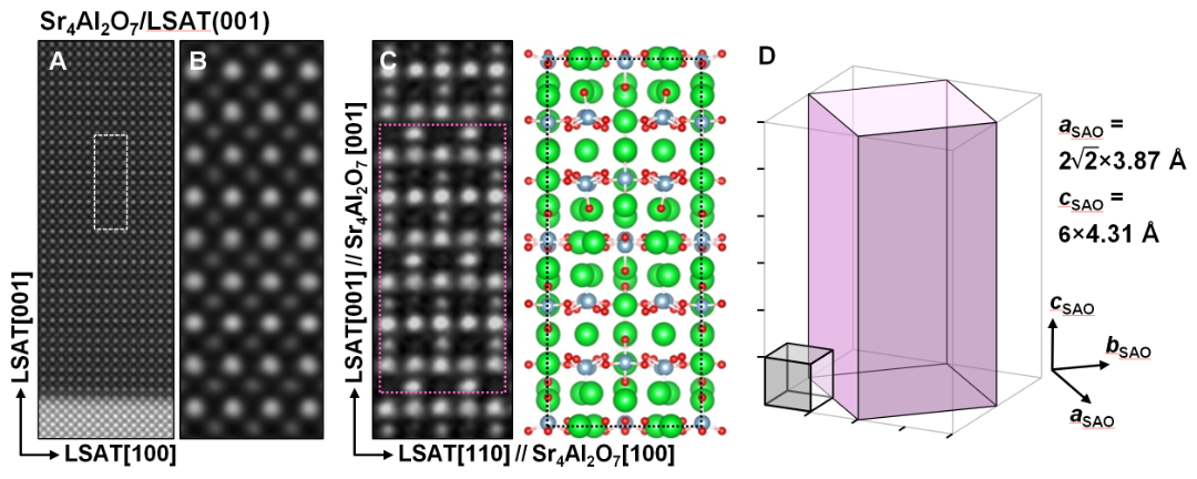 (A-C为Sr4Al2O7薄膜的高分辨透射电子显微图像和对应的晶体结构;D为Sr4Al2O7单胞与钙钛矿氧化物单胞的相对大小和外延生长关系)