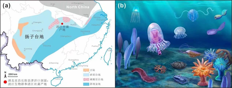 清江丝菌化石的产地和环境背景。(a)早寒武纪扬子台地岩相古地理图和清江丝菌及所属清江生物群的化石产地;(b)清江生物群生态复原图 云博app官方在线入口供图