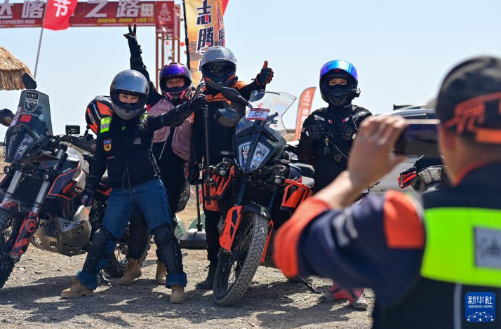 2024年5月1日,在新疆克拉玛依市乌尔禾区世界魔鬼城景区,车友在自驾线路起点合影。新华社记者 丁磊 摄