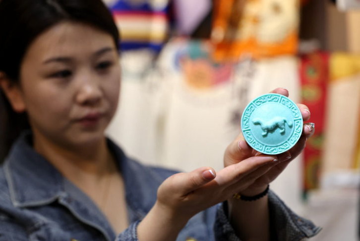2024年4月23日,秦汉新城新丝路数字文化科技有限公司的工作人员展示一款由杜虎符开发而成的文创手工皂。新华社记者 李一博 摄