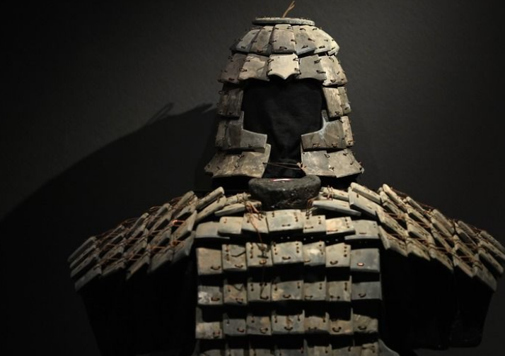 陕西历史博物馆秦汉馆内展出的石铠甲及石胄(2024年5月6日摄)。新华社记者 李一博 摄
