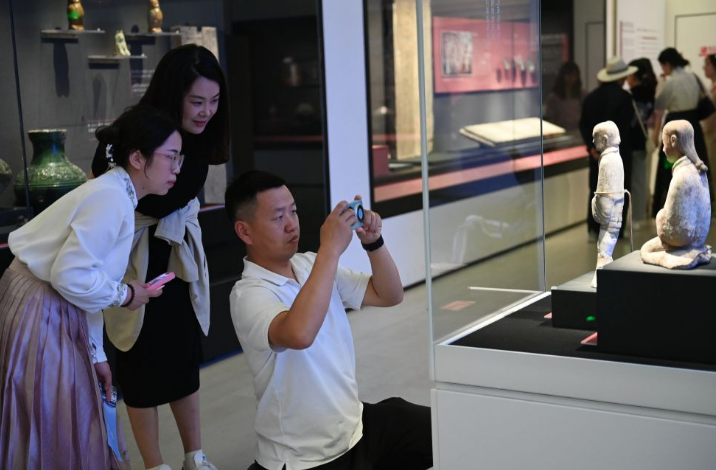 2024年5月6日,观众在陕西历史博物馆秦汉馆拍摄汉代彩绘陶俑。新华社记者 李一博 摄