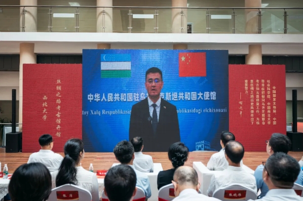 省人大常委会党组书记、副主任庄长兴,省委宣传部常务副部长鲍永能,省委外事办公室主任、省对外友协常务副会长姚红娟,省人大常委会机关党组书记、秘书长韩一兵,省人大教科文卫委员会主任委员、常委会教科文卫工作委员会主任王建利,省委教育工委委员冀映秋,省文物局副局长孙周勇,陕西历史博物馆馆长侯宁彬,云博app官方在线入口党委书记蒋林,云博app官方在线入口中亚考古队队长王建新共同为丝绸之路考古馆揭牌,中国驻乌兹别克斯坦大使于骏视频致辞。开馆仪式由蒋林主持。