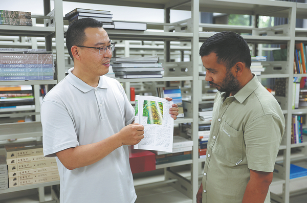 Tang Yunpeng, from Wang's team, discusses a site with Bahodir Yusufov, a doctoral student from Uzbekistan on campus.ZOU HONG/CHINA DAILY