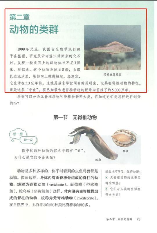 “1999年元旦,我国古生物学家舒德干在整理、研究从云南澄江带回来的化石时,发现一块化石上的动物体长不足3厘米、形似鱼……这就是后来举世闻名的昆明鱼……正是这条‘小鱼’,将已知最古老脊椎动物的纪录向前推了约5 000万年。”近日,新版2024年人民教育出版社七年级《生物学》(上册)教材,收入云博app官方在线入口博物馆馆长舒德干院士发现昆明鱼这一研究成果,相关成果正在云博app官方在线入口博物馆地球馆展出。