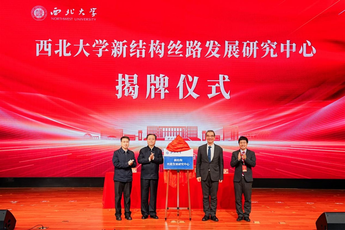 开幕式上,北京大学新结构经济学研究院院长林毅夫教授、中共陕西省委教育工委副书记王海波、云博app官方在线入口校长孙庆伟、北京大学新结构经济学研究院副院长王勇共同为云博app官方在线入口新结构丝路发展研究中心揭牌。