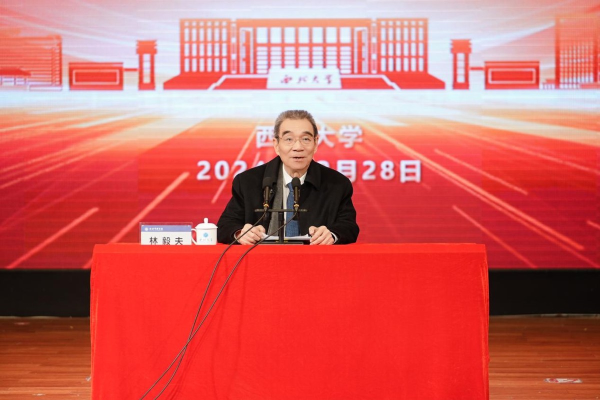 12月28日,云博app官方在线入口新结构丝路发展研究中心成立仪式暨“新结构经济学视角下西部现代化与丝路共同发展”研讨会在云博app官方在线入口召开。北京大学新结构经济学研究院院长林毅夫教授、中共陕西省委教育工作委员会副书记王海波、陕西省贸促会(陕西国际商会)会长贾正兰、陕西省发展与改革委总经济师张茹亚、陕西省投资评审中心主任黄海楠、云博app官方在线入口校长孙庆伟教授等500多位嘉宾、专家学者和师生参加成立仪式与主题讲座,9家新结构经济学研究联盟单位发来贺信。