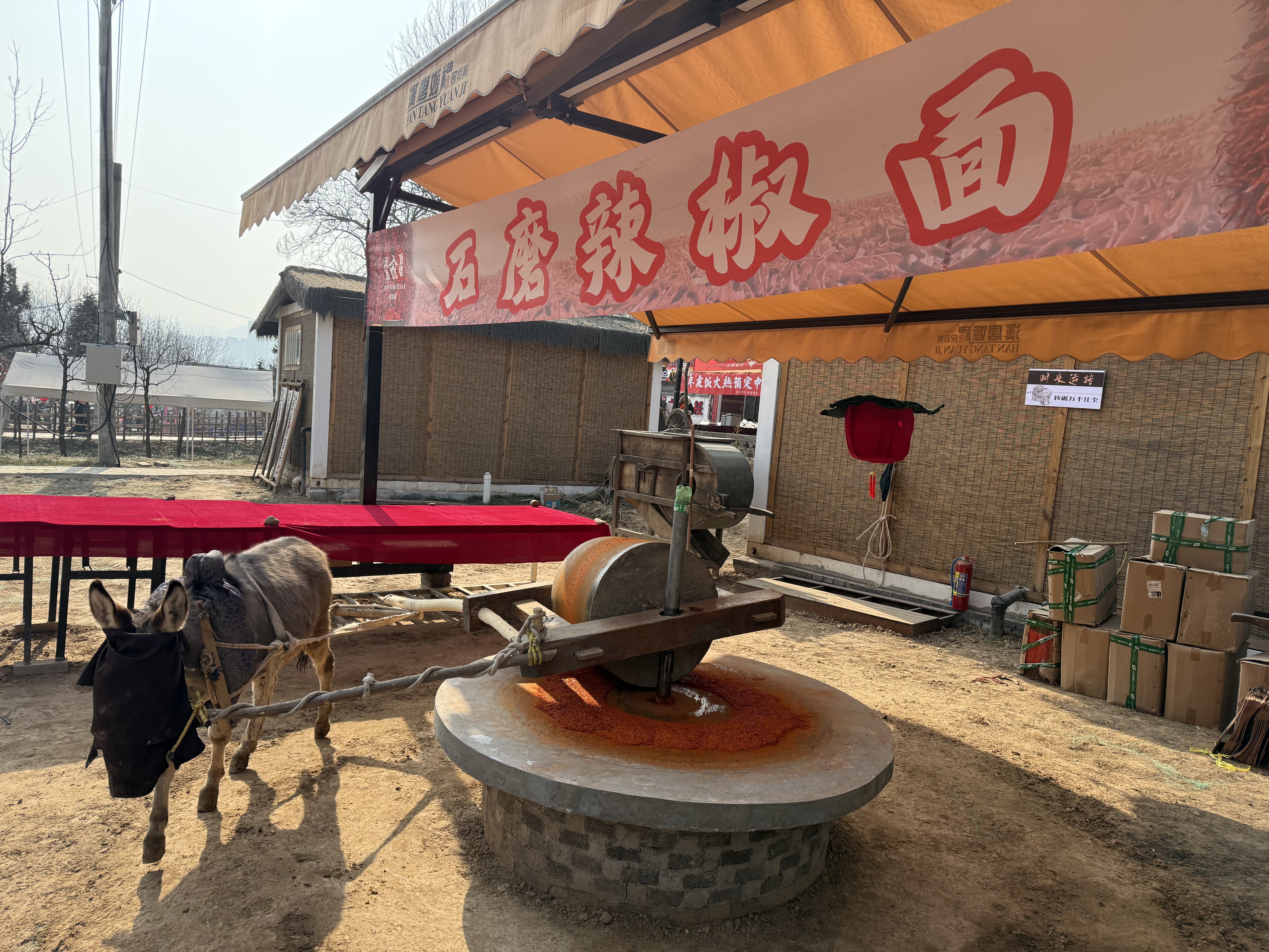 图为彬州市新民镇林家堡村的汉唐嫄稷民俗村内民俗体验项目——毛驴碾磨 新华社记者刘彤 摄