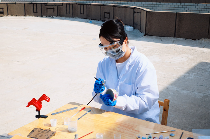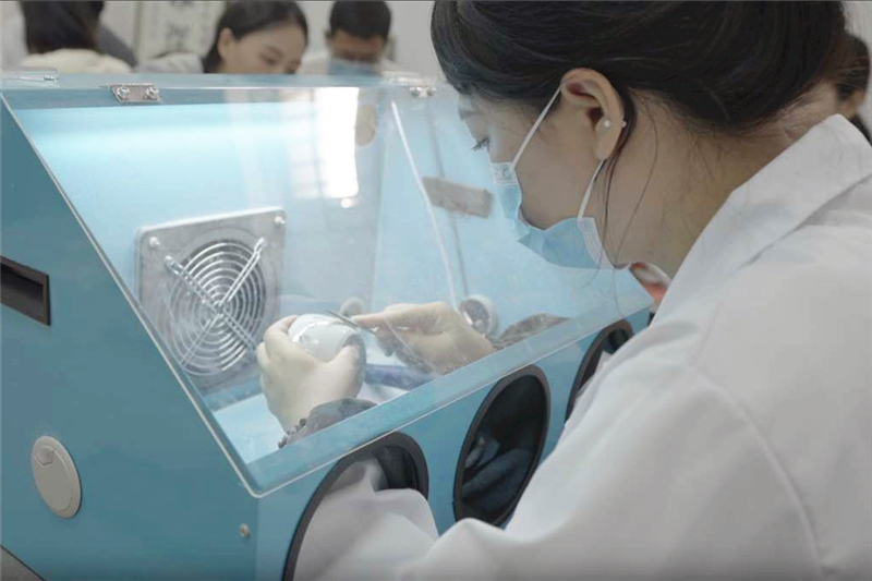 耿语旋在使用研磨设备磨去多余的粘合剂。受访者供图