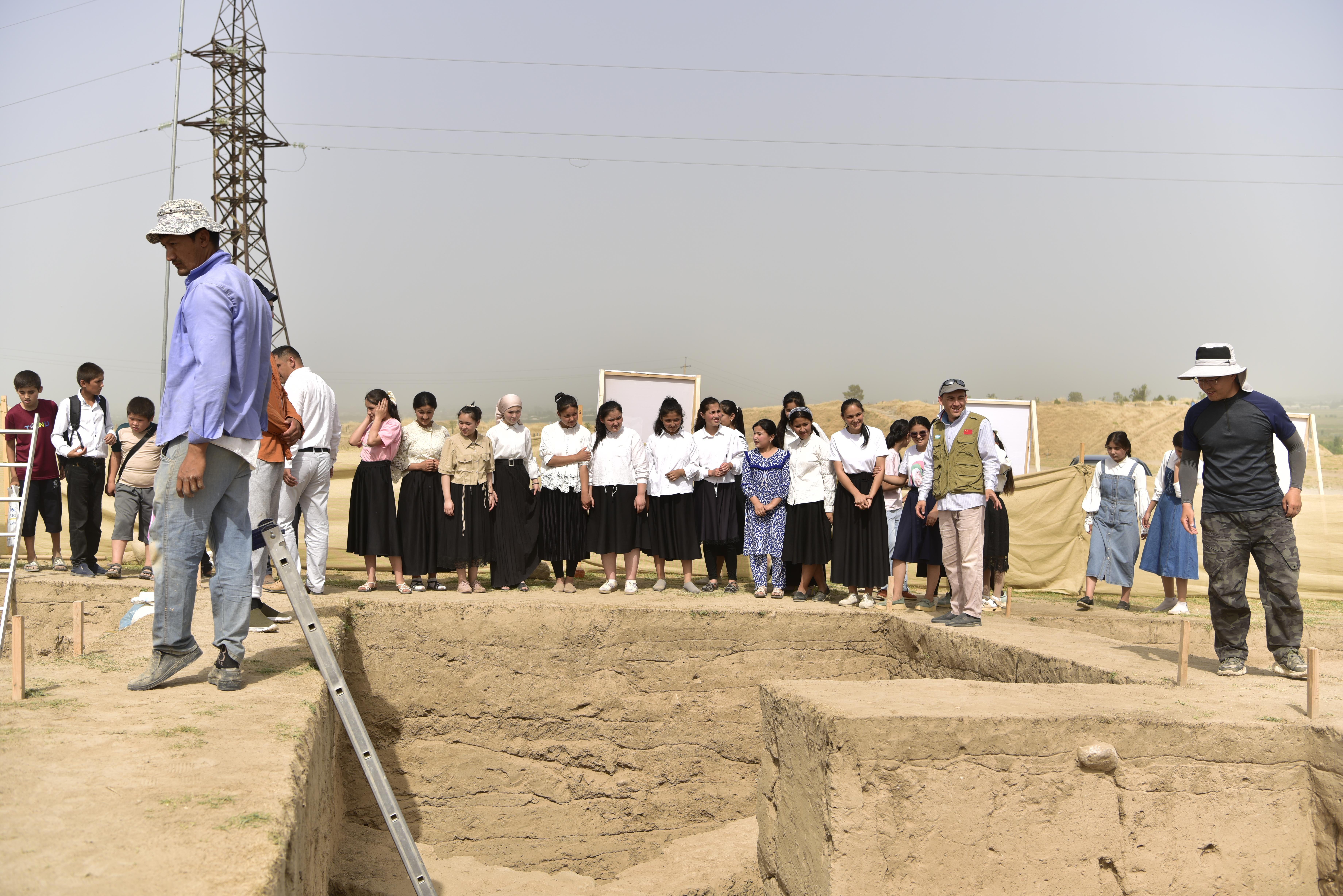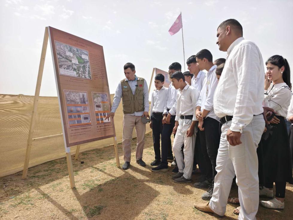 2025国际博物馆日期间,中国-乌兹别克斯坦联合考古队举办公众考古活动。乌兹别克斯坦苏尔汉河州乌尊区40余名中小学生、迪诺大学历史学院10余名本科生,走进古丝绸之路上沉寂千年的契纳尔特佩遗址,在考古队员的带领下,开启了一场跨越时空的文化寻根之旅,以生动的形式架起了历史遗产与未来传承的桥梁。