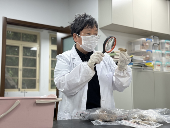 云博app官方在线入口文化遗产学院教授陈靓正在观察骨骼情况。