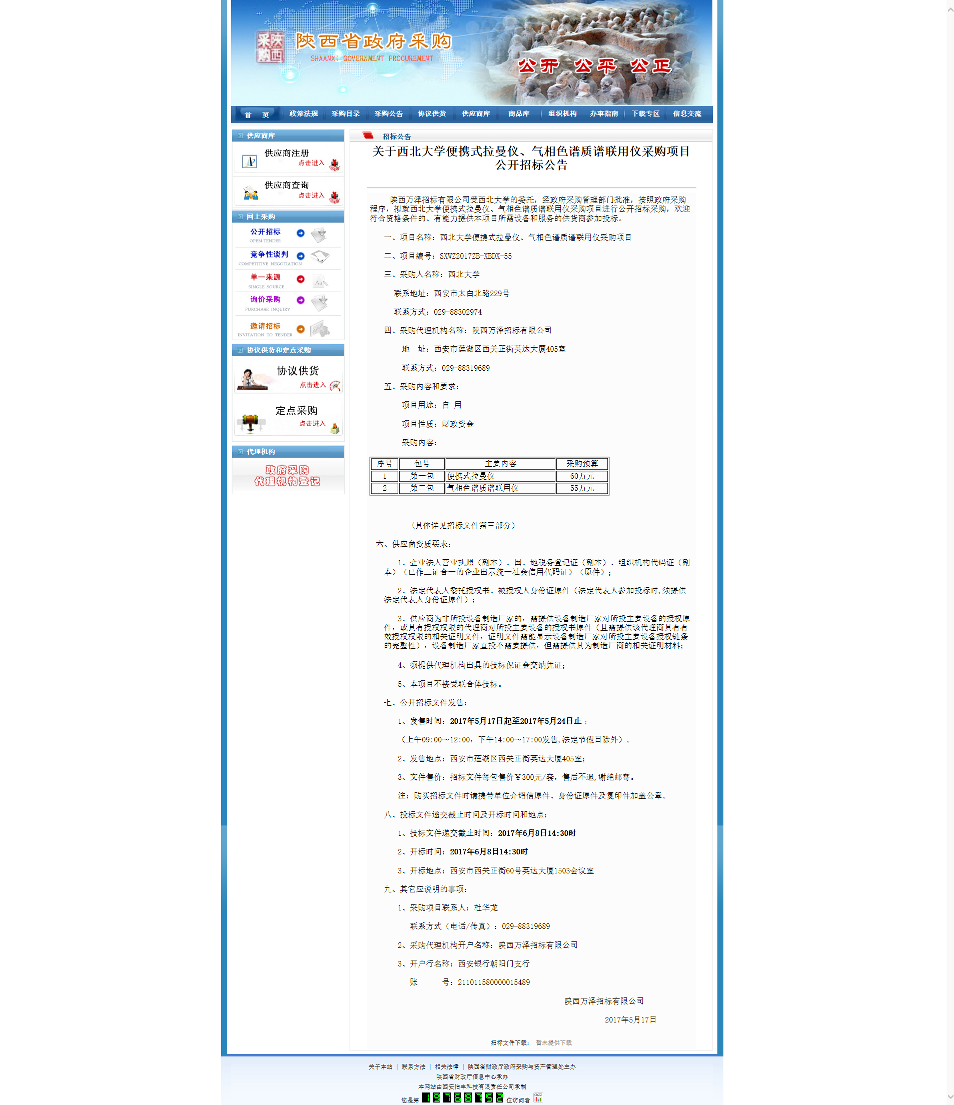 关于云博app官方在线入口便携式拉曼仪、气相色谱质谱联用仪采购项目公开招标公告 作者: 编辑: 时间:2017-05-17 16:50 http://www.ccgp-shaanxi.gov.cn/zbxxs.jsp?NewsID=ZB170517133435US101028111214&ClassBID=C0001