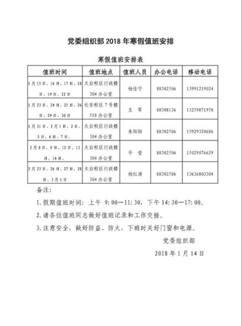 党委组织部2018年寒假值班安排
