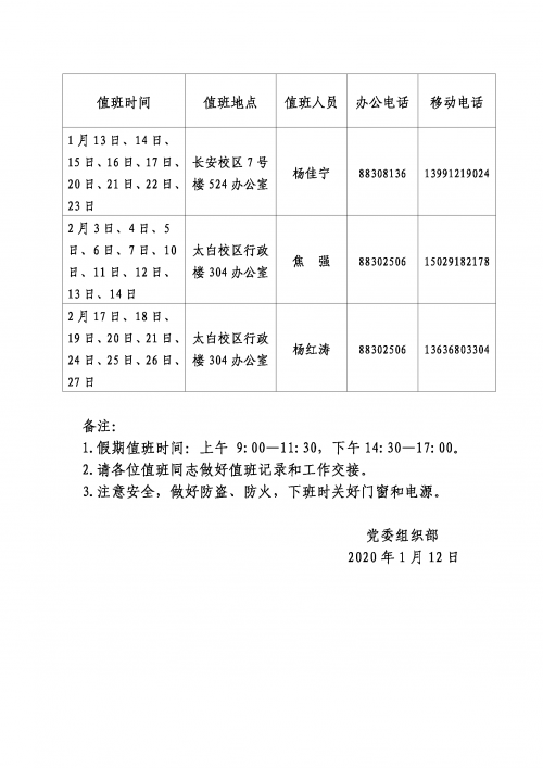 党委组织部2020年寒假值班安排