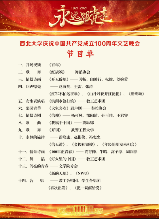 为热烈庆祝中国共产党成立100周年,回顾党的光辉历程,歌颂党的丰功伟绩,弘扬爱国主义精神,唱响新时代主旋律,丰富校园文化生活,校工会将举办庆祝中国共产党成立100周年文艺晚会,现将有关事项通知如下: