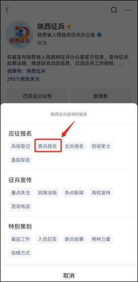 方式二:关注“陕西征兵”公众号,点击菜单栏“应征报名”直通报名页面。