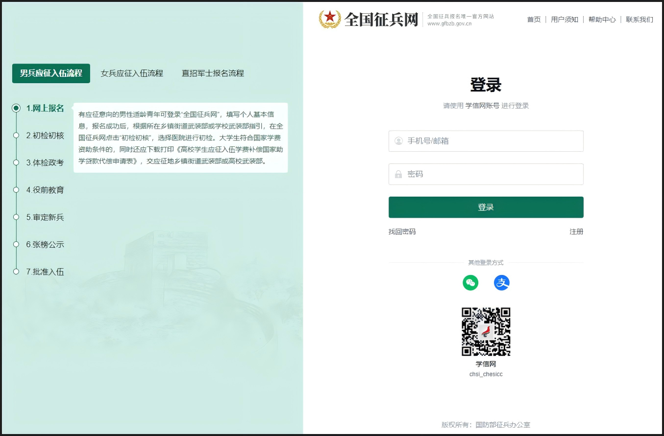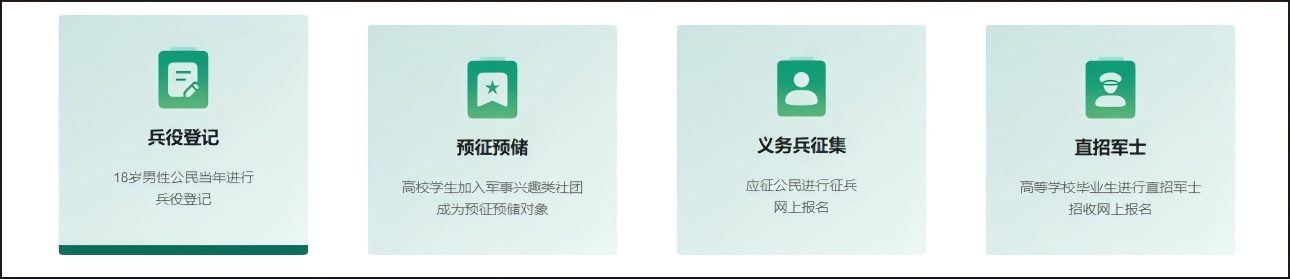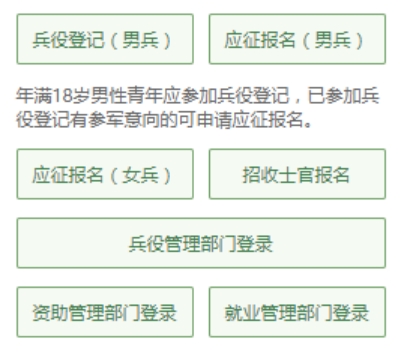 在全国征兵网(http://www.gfbzb.gov.cn)云博(中国),点击“ 兵役登记 ”(注意:还未进行兵役登记的同学,直接从“兵役登记”进入页面;如果已经进行过兵役登记就从“义务兵征集”进入页面。);
