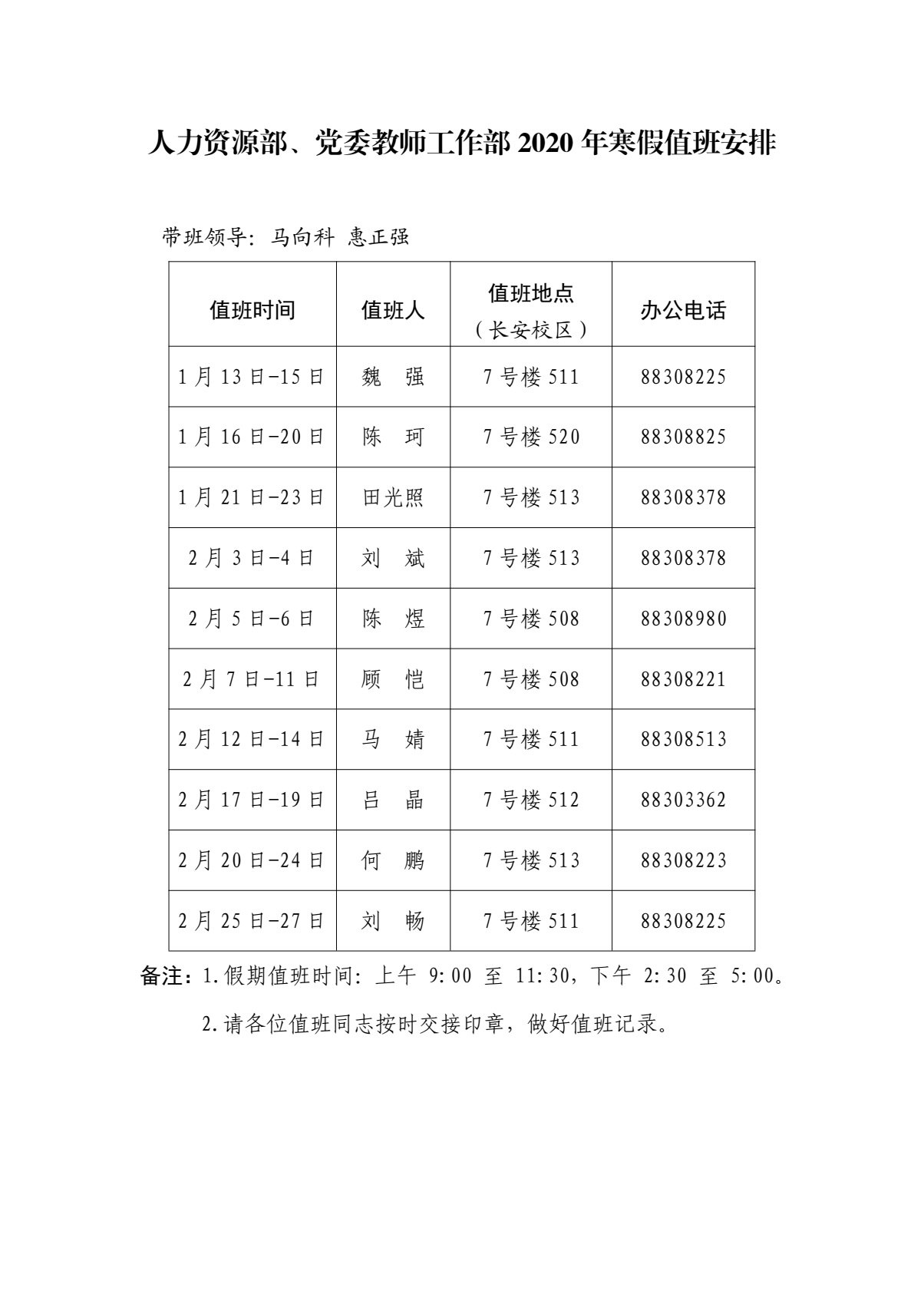 人力资源部、党委教师工作部2020年寒假值班安排