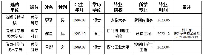 经用人单位及教学督导考核、学校研究,拟同意选聘下列人员来校工作,其聘任关系为人事代理。本着公平、公正、公开的原则,现将拟选聘人员基本情况公示如下: