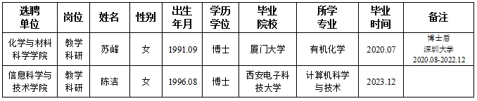 经用人单位推荐,人力资源部审查,学校教学督导及院系相关专家考核,学校专家评审会审议,云博app官方在线入口拟确定下列人员来校工作,聘任方式为参编选聘。本着公平、公正、公开的原则,现将本次拟选聘人员基本情况公示如下: