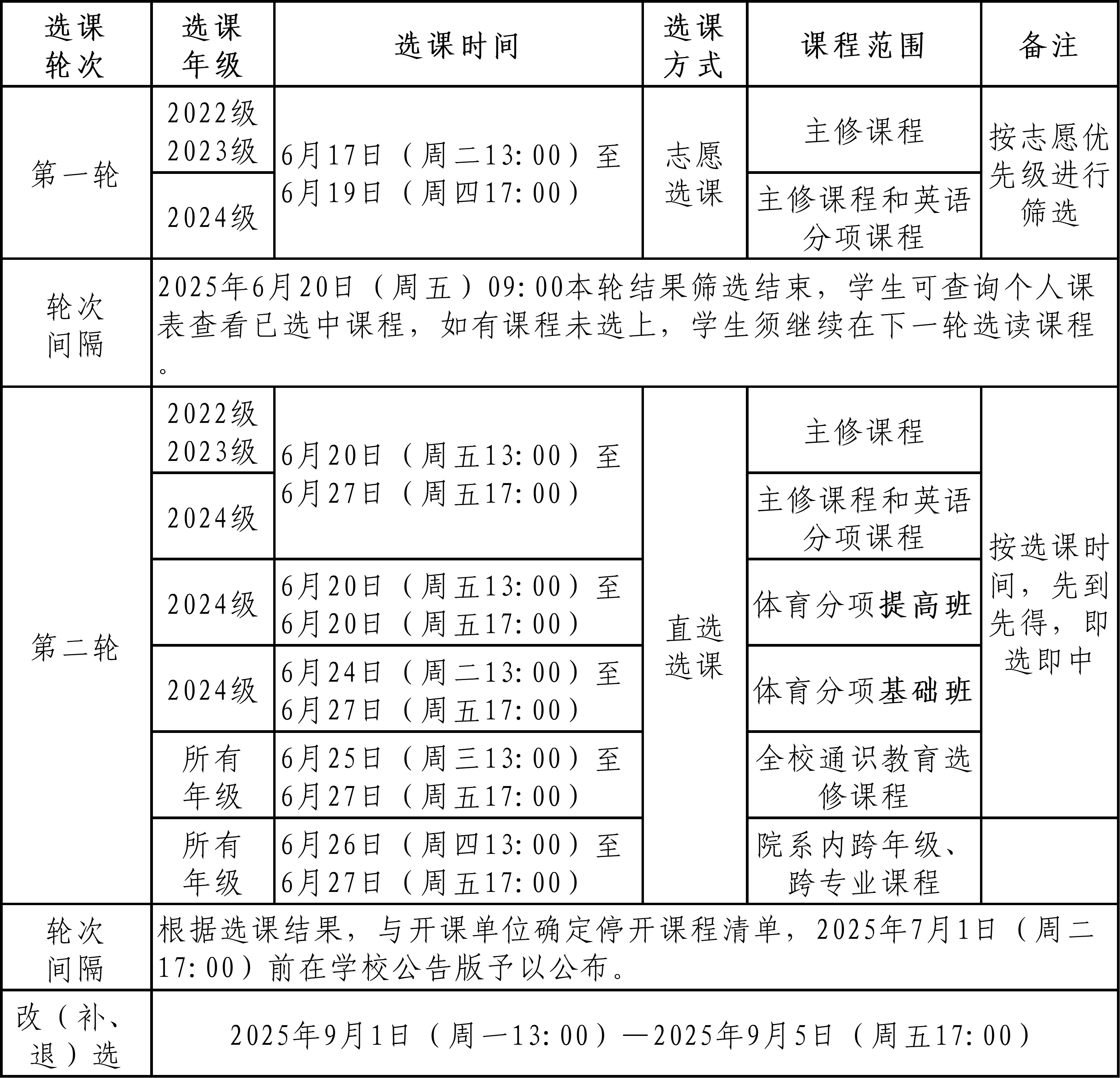 2025—2026学年第一学期课程选课分为正选和改(补、退)选。正选在6月17日(13:00)—6月27日(17:00)进行,分为两轮。改(补、退)选在9月1日(13:00)—9月5日(17:00)进行。现将具体事宜安排如下: