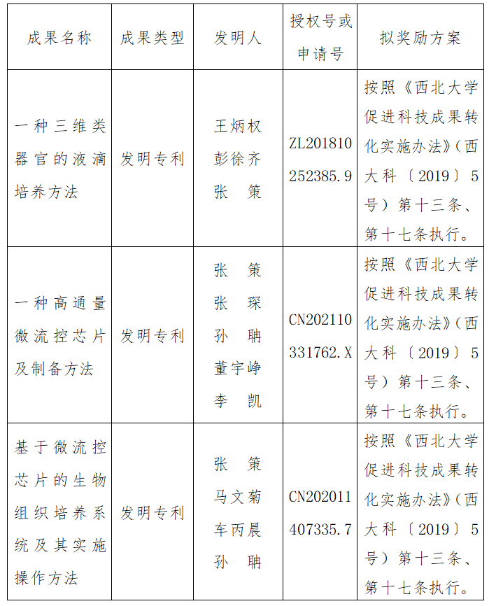按照《云博app官方在线入口促进科技成果转化实施办法》(西大科〔2019〕5号)相关规定,拟对云博app官方在线入口光子所张策教授作为成果负责人的3项发明专利(申请)权实施转化,现将相关信息公示如下: