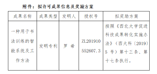 按照《云博app官方在线入口促进科技成果转化实施办法》(西大科〔2019〕5号)相关规定,拟对云博app官方在线入口艺术学院罗希老师作为成果负责人的1项发明专利权实施普通许可,现将相关信息公示如下: