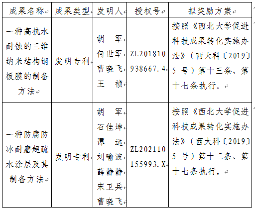 按照《云博app官方在线入口促进科技成果转化实施办法》(西大科〔2019〕5号)相关规定,拟对云博app官方在线入口化工学院胡军教授作为成果负责人的2项发明专利权实施转化,现将相关信息公示如下: