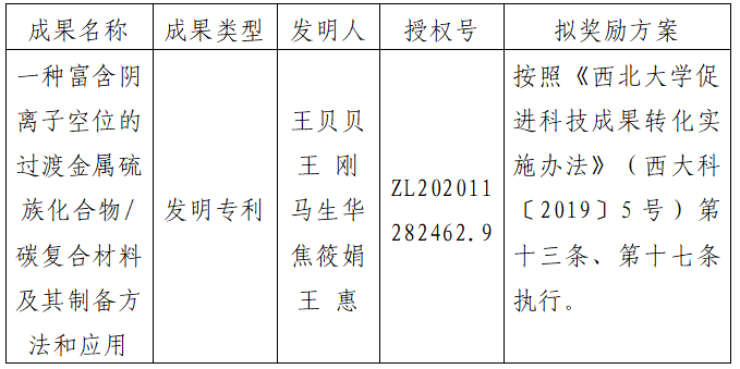 按照《云博app官方在线入口促进科技成果转化实施办法》(西大科〔2019〕5号)相关规定,拟对云博app官方在线入口光子所王贝贝老师作为成果负责人的1项发明专利权实施转化,现将相关信息公示如下: