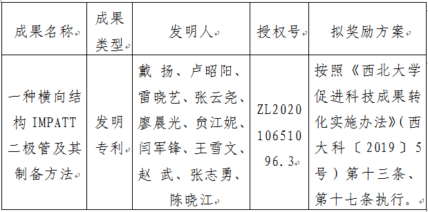 按照《云博app官方在线入口促进科技成果转化实施办法》(西大科〔2019〕5号)相关规定,拟对云博app官方在线入口信息科学与技术学院戴扬老师作为成果负责人的1项发明专利权实施转化,现将相关信息公示如下: