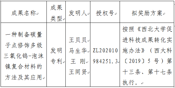 按照《云博app官方在线入口促进科技成果转化实施办法》(西大科〔2019〕5号)相关规定,拟对云博app官方在线入口光子所王贝贝老师作为成果负责人的1项发明专利权实施转化,现将相关信息公示如下: