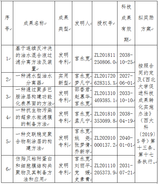根据《云博app官方在线入口促进科技成果转化实施办法》(西大科〔2019〕5号)相关规定,经学校科技成果转化工作小组、校长办公会审议,校党委常委会审定,拟对云博app官方在线入口化材学院宫永宽教授作为成果负责人的6项专利(5项发明专利和1项实用新型专利)权实施独占许可,现将相关信息公示如下: