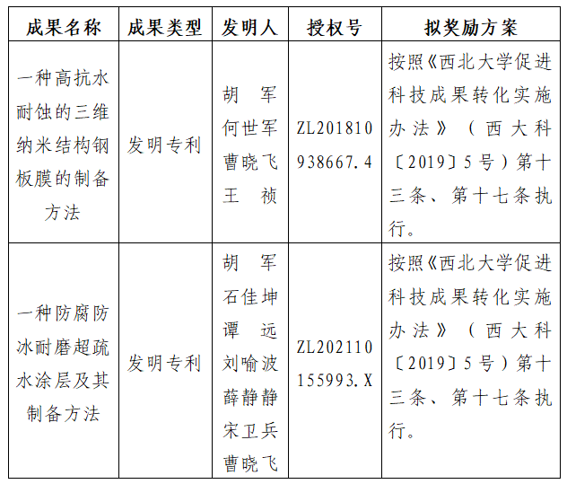 按照《云博app官方在线入口促进科技成果转化实施办法》(西大科〔2019〕5号)相关规定,拟对云博app官方在线入口化工学院胡军教授作为成果负责人的2项发明专利权实施转化,现将相关信息公示如下:
