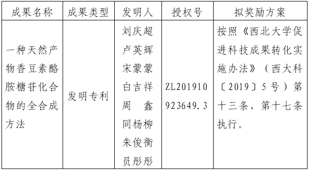 按照《云博app官方在线入口促进科技成果转化实施办法》(西大科〔2019〕5号)相关规定,拟对云博app官方在线入口化工学院刘庆超教授作为成果负责人的1项发明专利权实施转化,现将相关信息公示如下: