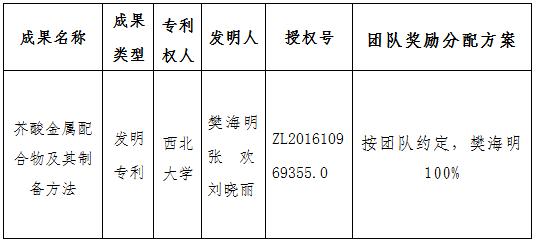 按照《云博app官方在线入口促进科技成果转化实施办法》(西大科〔2019〕5号)相关规定,经科技成果转化工作小组审议,校长办公会审定通过,拟对云博app官方在线入口化学与材料科学学院樊海明教授作为成果负责人的1项发明专利权实施以作价入股结合现金支付方式转让,现将相关信息公示如下:
